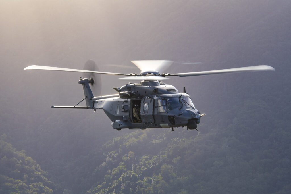 An NH90 assisting with relief in Australian bushfires, 2019-2020. (ADF Official)RNZAF NH90s operating from a helicopter carrier in Exercise Talisman Sabre 2025. (ADF Official)
